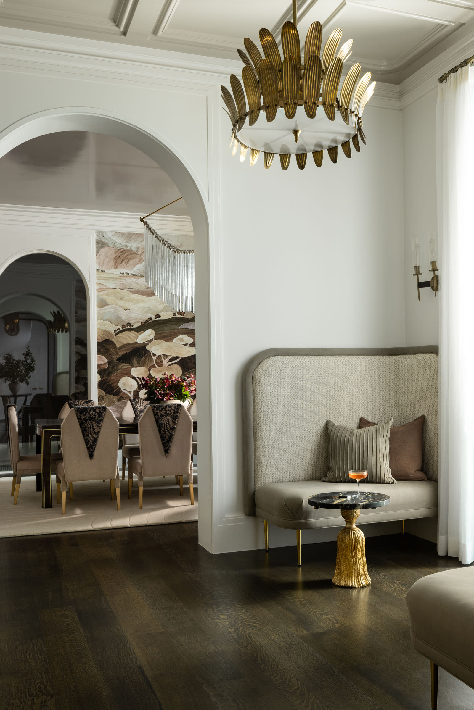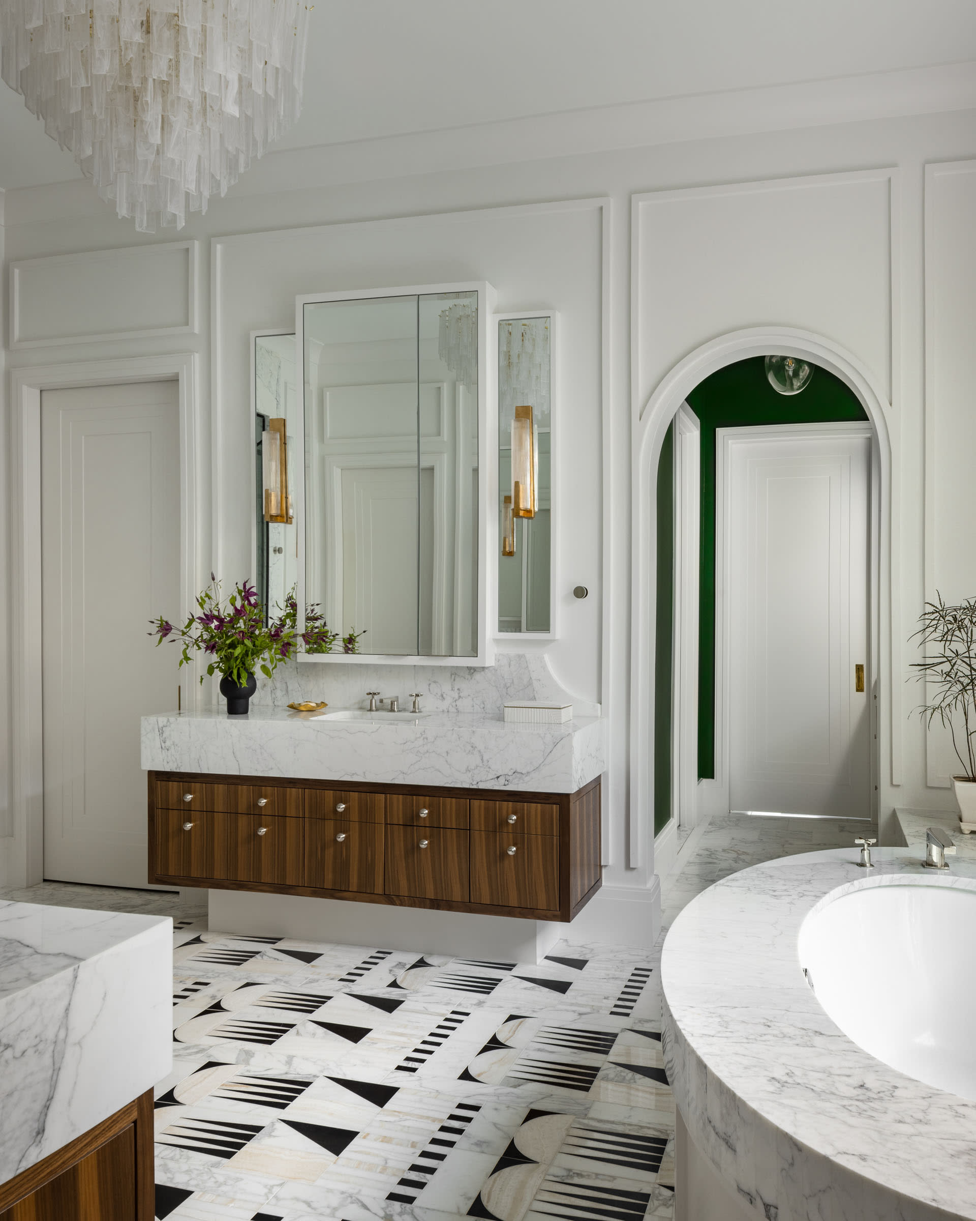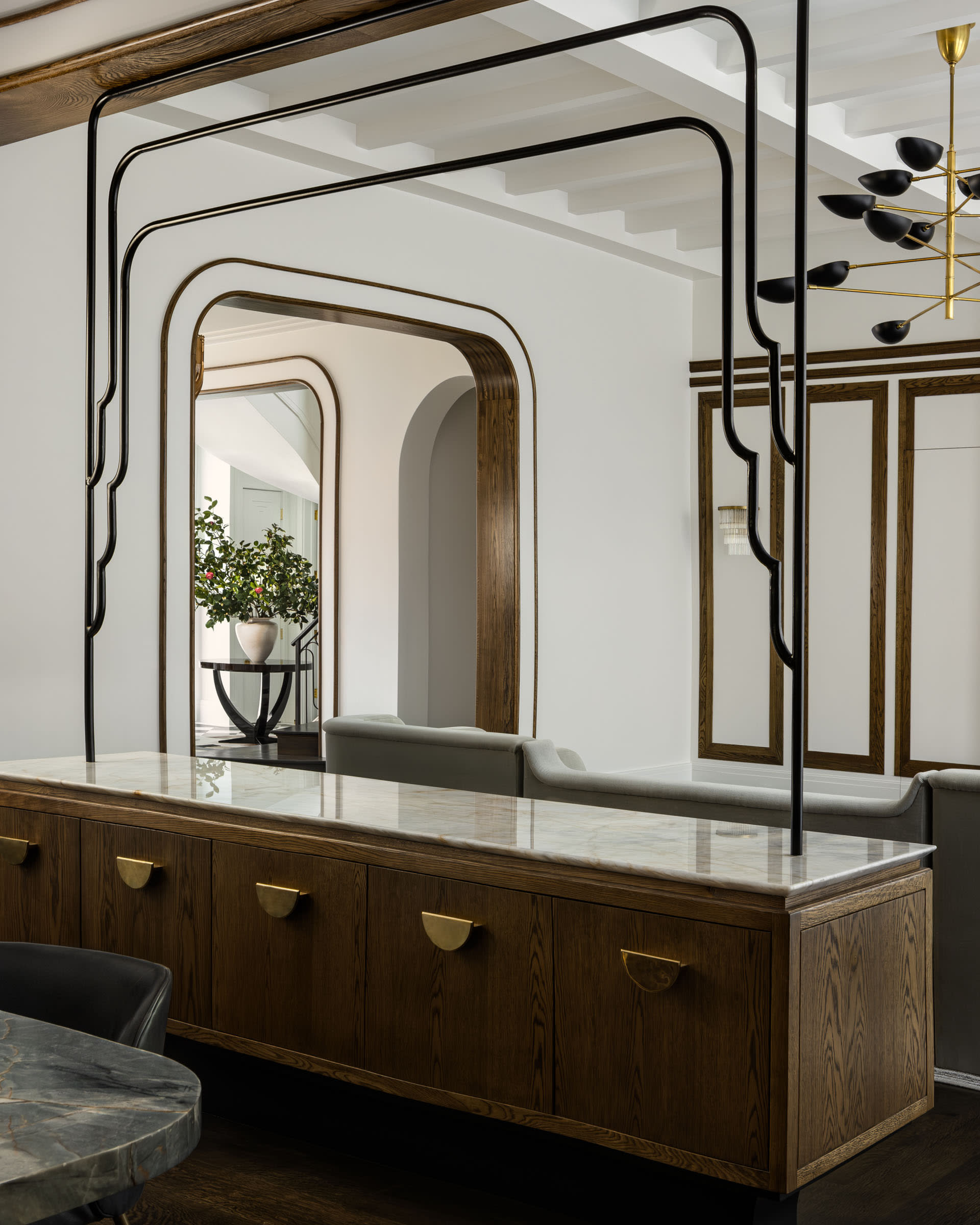 Several moments draw directly from places meaningful to the clients. The parlor bar, for example, was modeled after the bar at Le Coucou, one of their favorite restaurants in New York. Interpreted through arched marble detailing and custom cabinetry, it creates a refined focal point that captures the spirit of Manhattan hospitality within the home.