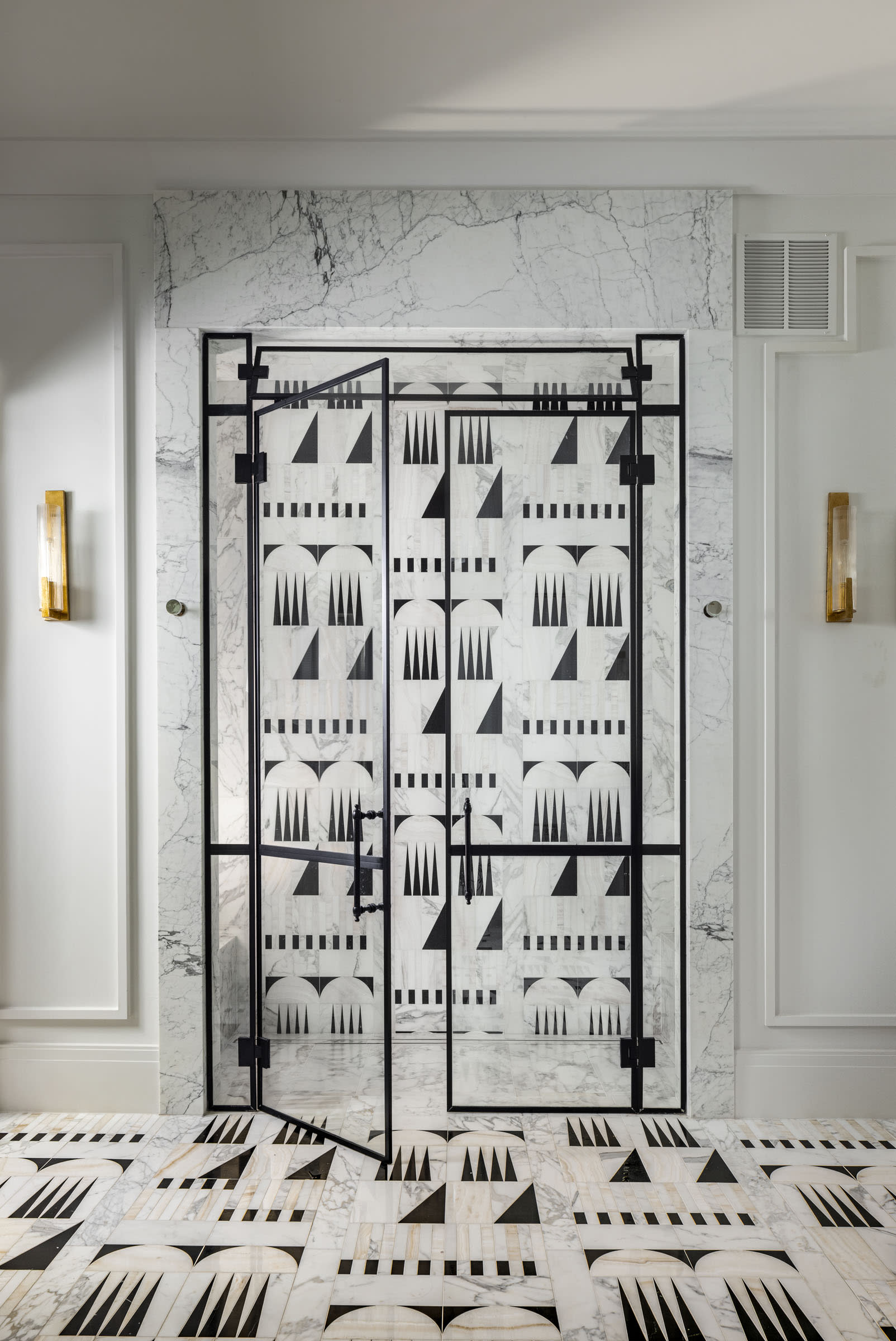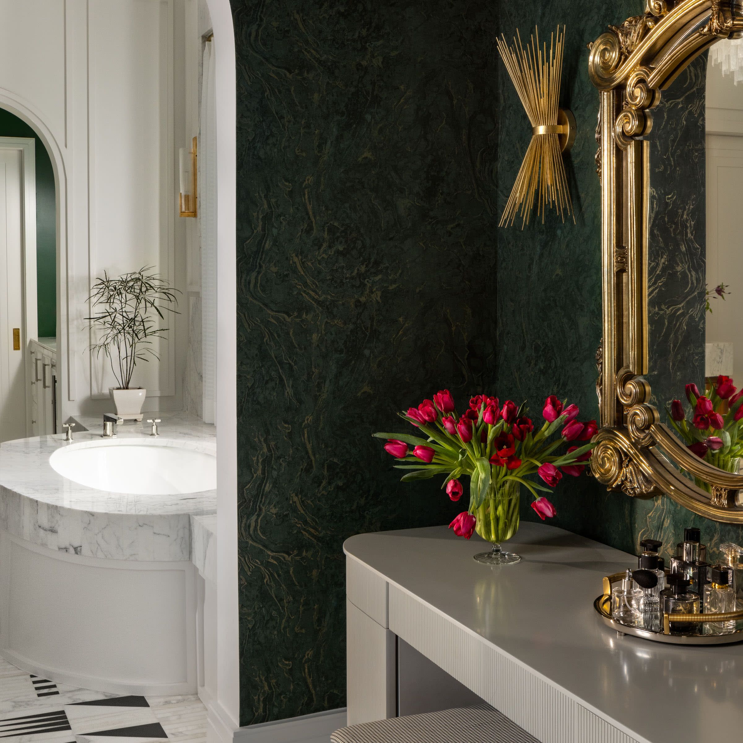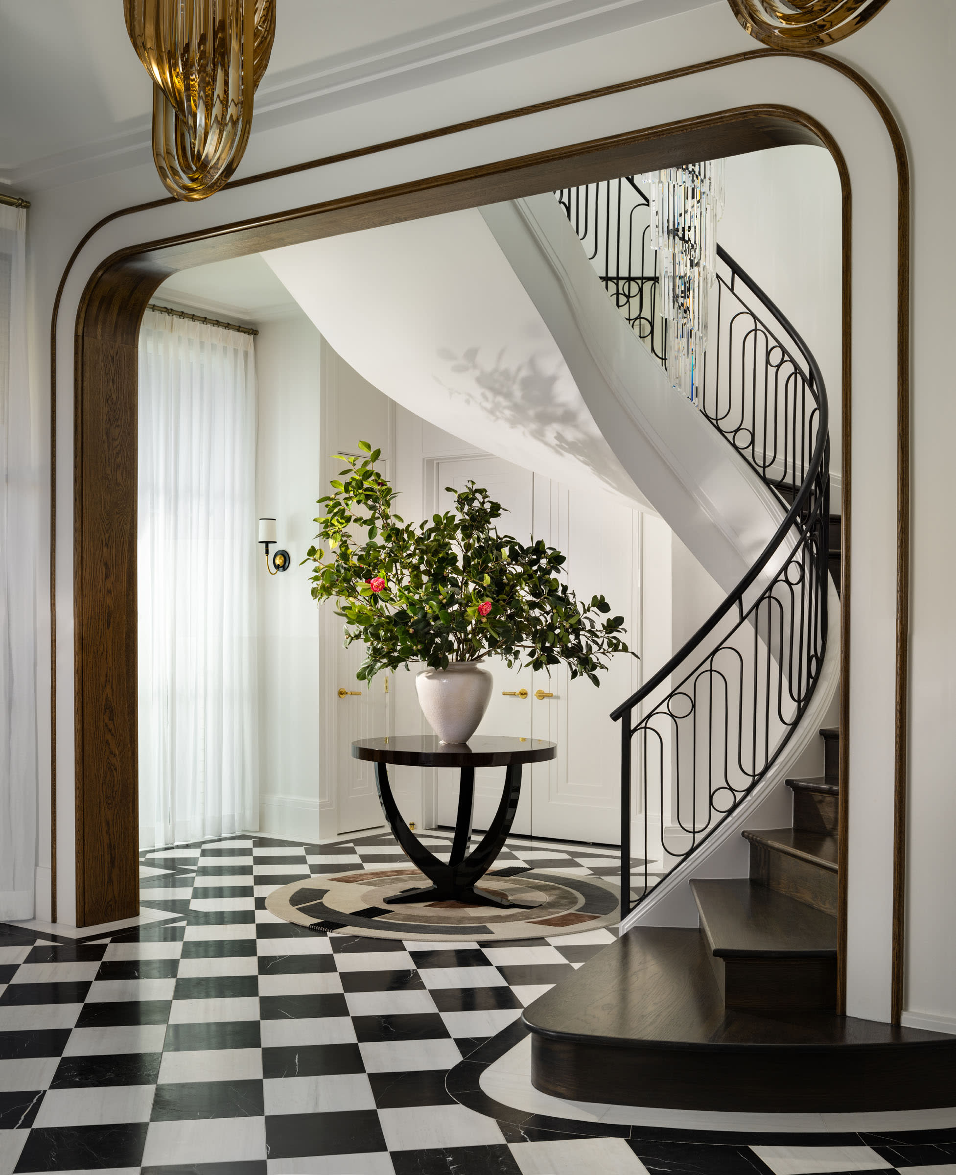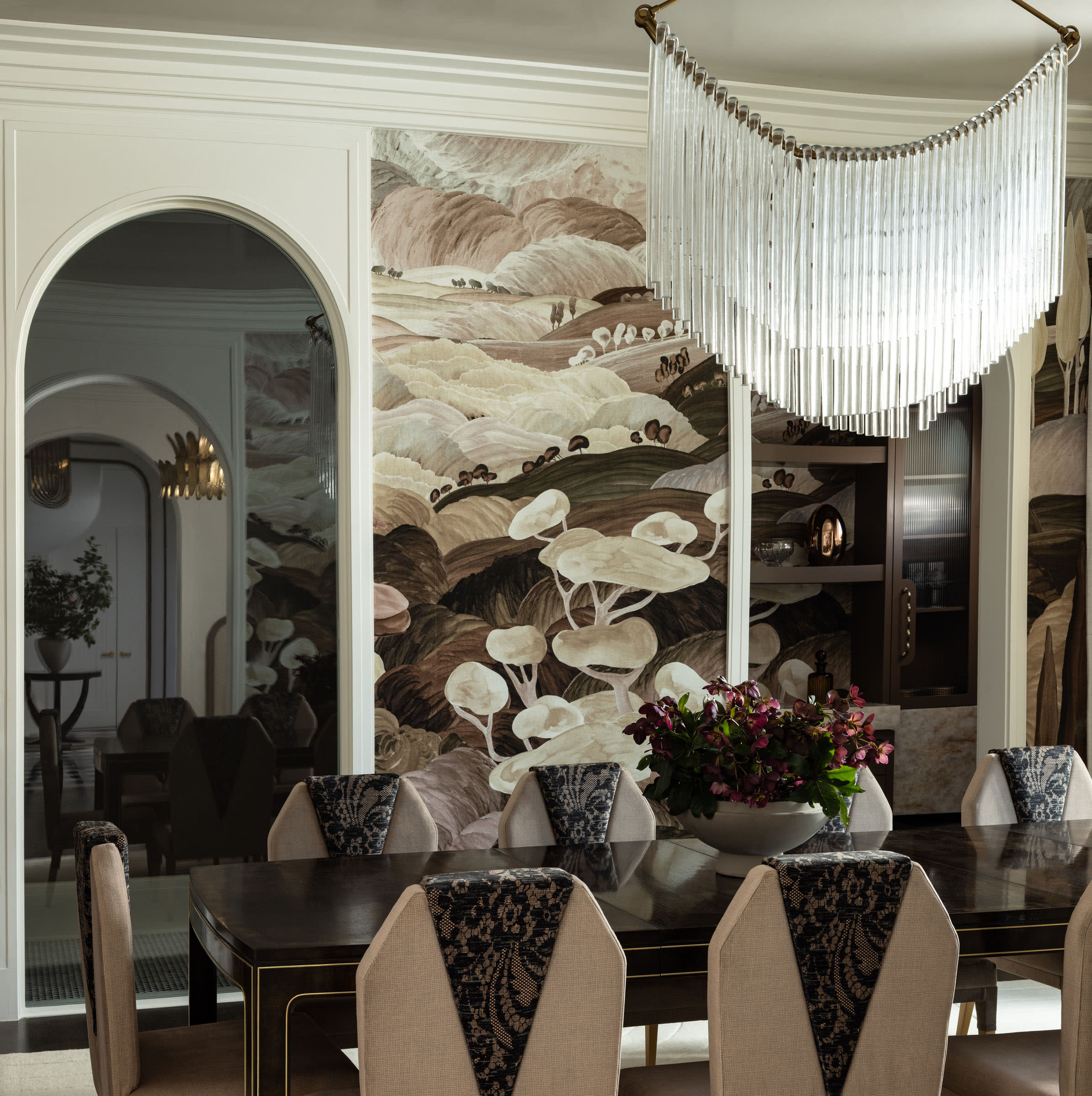 Several moments draw directly from places meaningful to the clients. The parlor bar, for example, was modeled after the bar at Le Coucou, one of their favorite restaurants in New York. Interpreted through arched marble detailing and custom cabinetry, it creates a refined focal point that captures the spirit of Manhattan hospitality within the home.